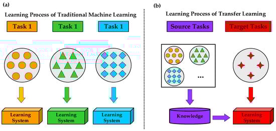 Different learning processes between traditional machine learning and transfer learning. (a) Traditional machine learning approaches learn each task independently, starting from scratch. (b) Transfer learning utilizes knowledge gained from previous tasks and applies it to a target task.
