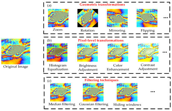 Data augmentation methods. (a) Geometric transformation-based data augmentation involves techniques like zoom, rotation, mirroring, and flipping to expand the training datasets. (b) Pixel-level transformation-based data augmentation modifies individual pixel values, such as brightness, contrast, and color, to enhance the datasets. (c) Filtering-based data augmentation involves applying filters like blurring, sharpening, and noise to diversify the training datasets. The original InSAR interferogram data were downloaded from the COMET-LiCS Sentinel-1 InSAR portal (https://comet.nerc.ac.uk/comet-lics-portal/ (accessed on 1 December 2024)).