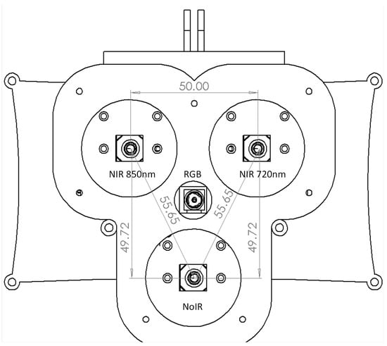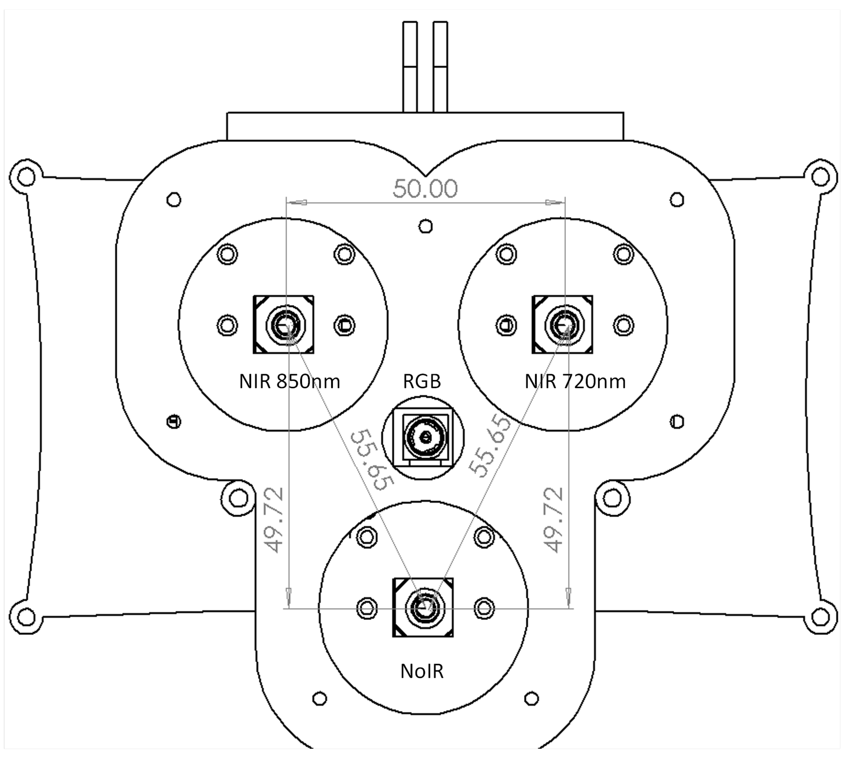 As depicted in Figure 3, the system includes four cameras: an RGB camera, a NoIR camera, and two near-infrared cameras equipped with filters for wavelengths of 720 nm and 850 nm. Each captured image contains a circular marker at the center of its field of view, serving as a reference point for alignment and calibration across channels. These markers are essential for synchronizing the spatial representation of data from all cameras, enabling consistent multispectral analysis.