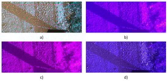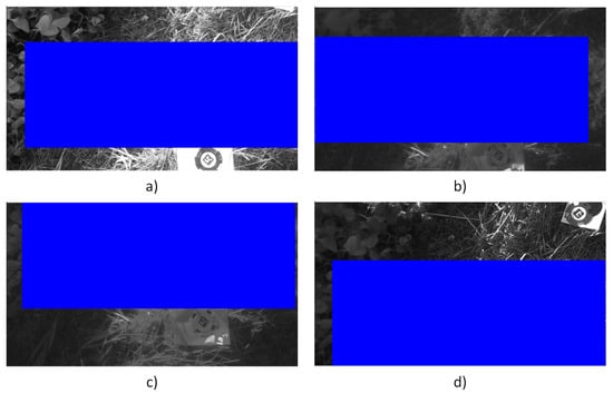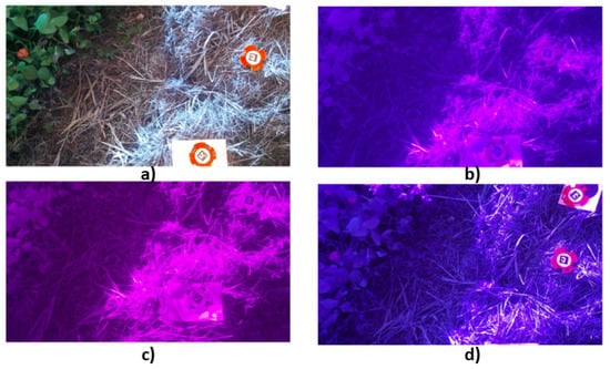 Cropped images using the IOU generated after the image processing described in Algorithm 1. (a) RGB camera, (b) 720 nm infrared camera, (c) 850 nm infrared camera, and (d) NoIR camera.