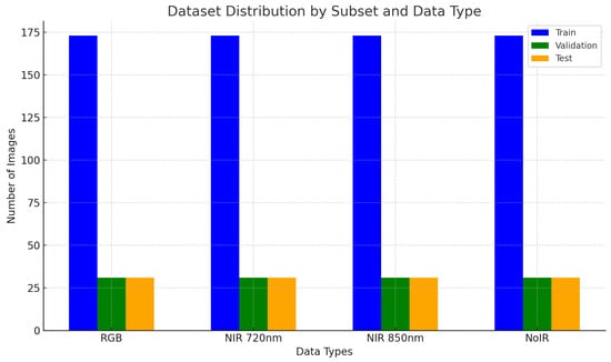 For our dataset, we captured images using a novel camera design with four synchronized cameras equipped with specific filters to capture the various spectral bands, as shown in Figure 2. The dataset is divided into training, validation, and test subsets, as summarized in Table 1. Each spectral band was equally distributed across the subsets to maintain consistency in training and evaluation.
