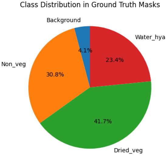 Figure 6 illustrates the distribution of the dataset across the training, validation, and test subsets for each spectral band. Additionally, the pixel-wise class distribution in the ground truth masks is presented in Figure 7, highlighting the proportions of each class: Background (4.08%), Non_veg (30.82%), Dried_veg (41.71%), and Water_hya (23.39%).