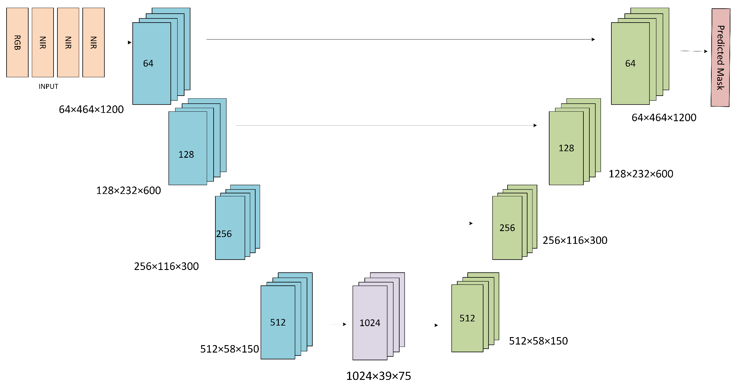 - Adaptability to Multispectral Data: The architecture was tailored to handle multispectral images with varying channel configurations (e.g., RGB, NIR, and RGB+NIR), showcasing its flexibility in incorporating different spectral bands to improve segmentation performance.