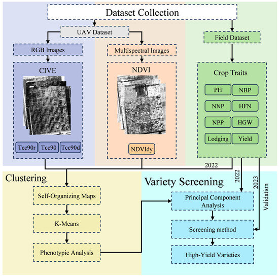 Therefore, the main goal of this study was to provide a variety-screening framework by combining UAV-based and field phenotyping and to identify the key phenotypic features related to high soybean yield. Firstly, this study conducted a cluster analysis on numerous test varieties based on UAV and field phenotypic data. Then, the relationships between various traits and yield were investigated, and the key traits of high-yield soybean variety screening were determined. Finally, the selection strategy and results based on the key phenotypic traits for high-yield soybean varieties were provided.