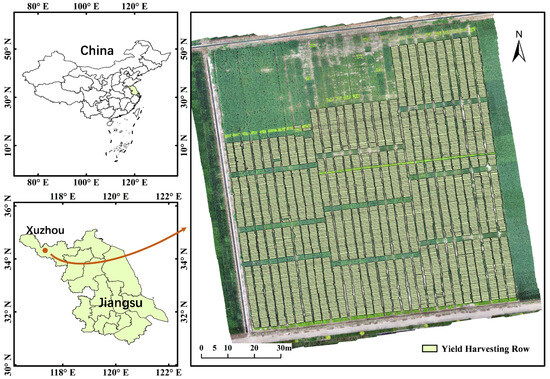 The datasets used in this study were collected from soybean breeding trials conducted at the Xuzhou experimental site (117°24′35″E, 34°18′41″N) during the 2022 and 2023 growing seasons (Figure 2). Located in the southeastern part of the North China Plain, the region has a temperate monsoon climate, with an average annual temperature of 14 °C and annual precipitation of 800 mm. Soybean in this area is typically sown in late June and harvested in early October.
