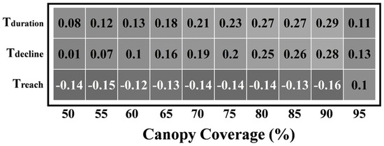 Pearson correlation coefficients between time-related traits at different canopy coverage levels and yield.