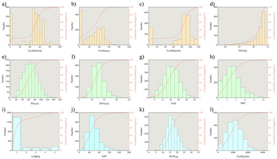 Statistics of phenotypic traits. Sub-panels (a–d) present UAV-derived phenotypic traits, including Tcc90r, Tcc90d, Tcc90, and NDVIdy; sub-panels (e–h) present plant-type traits, including PH (plant height), NBP (number of branches per plant), NNP (number of nodes per plant), and HFN (height of the fifth node); and sub-panels (i–l) present the traits of lodging, NPP (number of pods per plant), HGW (hundred-grain weight), and yield.