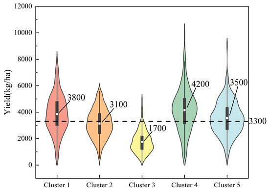 The yield distribution of five types of soybeans obtained by clustering. The average yield of all soybean varieties was 3300 kg/ha. The black box indicates the lower quartile to the upper quartile, and the white square represents the mean of each cluster. Larger contours indicate a higher concentration of data in that area, while smaller contours suggest fewer data in that region.