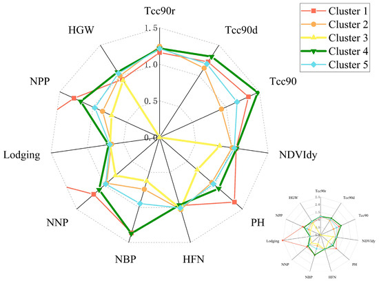The 11 investigated phenotypic traits of the five soybean clusters, including Tcc90r, Tcc90d, Tcc90, NDVIdy, PH, HFN, NBP, NNP, Lodging, NPP, and HGW, are illustrated in Figure 6. To facilitate comparison and visualization, the traits of the five soybean clusters were normalized by dividing the mean value of each cluster by the mean value of all the soybean varieties. There was little difference in the performance of the five categories on Tcc90r, NDVIdy, HFN, and HGW. The performance of Tcc90, Tcc90d, and NBP showed the same change as the yield, indicating that extending the duration of high canopy coverage and delaying its decline, along with increasing the number of branches, might have enhanced soybean yield. However, the performance of PH, NNP, and NPP differed from their yield trends. The performance of Cluster 1 outperformed Cluster 4 in these three phenotypic traits, yet its yield was lower. This might have been due to excessively high PH, which led to greater NNP and NPP but also increased the risk of lodging [32]. Lodging typically had a negative impact on yield [33].