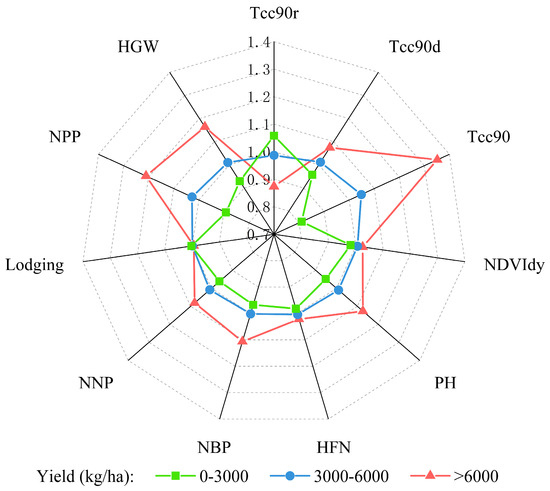 To facilitate comparison and visualization, the traits of the three yield-level groups were normalized by dividing the mean value of each cluster by the mean value of all the soybean varieties (Figure 7). It was observed that among these traits, high-yield varieties (>6000 kg/ha) exhibited superior performance in NPP and HGW, which directly contributed to their high yield. These varieties showed lower Tcc90r and higher Tcc90 and Tcc90d values. This indicated that high-yield soybean varieties exhibited rapid canopy development, prolonged duration of high canopy coverage, and a delayed decline in canopy coverage. Additionally, the high-yield group demonstrated notable advantages in traits such as PH, NBP, and NNP. The medium-yield group (3000–6000 kg/ha) displayed trait performance that fell between the high- and low-yield groups, and the low-yield group (0–3000 kg/ha) performed poorly in most traits. Among all tested traits, Tcc90 exhibited the greatest variation, suggesting it may be one of the key factors influencing yield. These results indicated that canopy-related traits should be paid more attention in soybean variety screening.