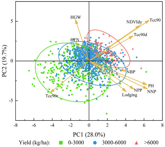 For identifying key traits in variety screening, this study categorized them into three groups: UAV-related traits (Tcc90r, Tcc90, Tcc90d, and NDVIdy), PH-related traits (PH, HFN, NBP, NNP, Lodging, and NPP), and HGW. UAV-related traits showed high correlations (Figure 8) but were relatively easy to obtain, with Tcc90r, Tcc90, and Tcc90d all being utilized for variety screening. NDVI has been widely demonstrated to be a good indicator of crop yield. However, the NDVIdy used in this study was not included in the screening process due to minimal differences between the three yield-level groups. PH-related traits were classified based on PCA results (Figure 8), and their performance aligned with findings from previous studies. Considering that these traits are manually acquired, only PH, which is relatively easy to obtain and has obvious differences between different groups, was selected for variety screening.