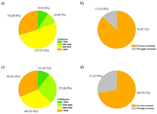 Among the 1923 varieties, 248 were selected, with 74 varieties having yields greater than 6000 kg/ha (top 5%), accounting for 29.8%. Only 23 varieties had yields below 3000 kg/ha (bottom 60%), making up 9.3% (Figure 10a). In total, there were 85 varieties with yields greater than 6000 kg/ha, of which 87% were successfully selected (Figure 10b). From 1015 varieties, 140 were selected, and 44 varieties had yields greater than 5000 kg/ha (top 5%), accounting for 31.4%. Among them, only 15 varieties had yields below 3000 kg/ha (bottom 60%), representing 10.7% (Figure 10c). Additionally, when analyzing the high-yield varieties, 61 varieties had yields greater than 5000 kg/ha, with 72% of them successfully selected (Figure 10d). These results clearly demonstrated that the method showed high accuracy and reliability in selecting high-yield soybean varieties.