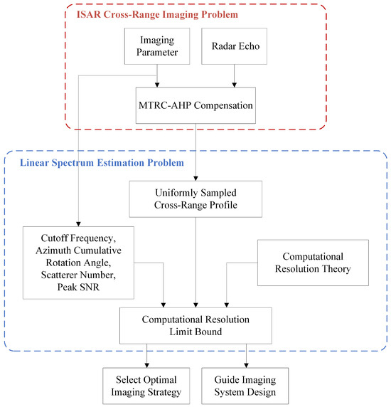 Super-resolution algorithms provide another effective solution for the nonlinear imaging problem in ISAR and synthetic aperture radar (SAR) imaging [16,25]. They can be divided into two main categories, namely, point-source and distributed-source techniques [26]. Point-source techniques treat the image as a set of finite discrete points, aiming to reconstruct their locations and amplitudes; typical algorithms include MUSIC, ESPRIT, CLEAN, RELAX, and Bandwidth Extrapolation(BWE). On the other hand, distributed-source techniques model the echo signal from each scatterer as a continuous high-resolution function over a regular sampling grid and filter it based on the Point Spread Function (PSF) of the imaging system. Typical algorithms include least squares (LS), singular value decomposition (SVD), Capon’s minimum variance method (MVM), and amplitude and phase estimation of a sinusoid (APES). Furthermore, [7,27,28,29,30,31] have discussed applications of compressed sensing (CS), deep learning, and adaptive algorithms, demonstrating their effectiveness in ISAR and SAR super-resolution imaging. While these algorithms have proven successful in reconstructing high-quality ISAR or SAR images across various applications, their performance limits are seldom addressed.