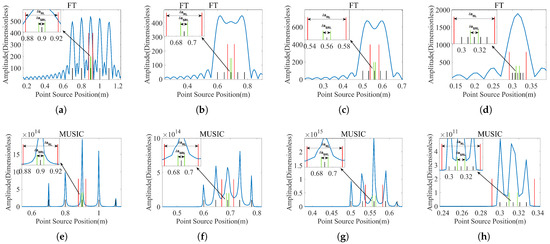 To better understand the meaning of these bounds, [48] provided a detailed explanation: without any additional prior information, stable location recovery from is achievable when exceeds the upper bound and impossible when falls below the lower bound; consequently, we can conclude that represents the optimal resolution capability of the imaging super-resolution algorithm, which no algorithm can surpass without additional prior information. In contrast, provides the criterion for whether a super-resolution algorithm can reliably achieve stable scatterer recovery