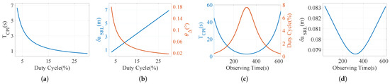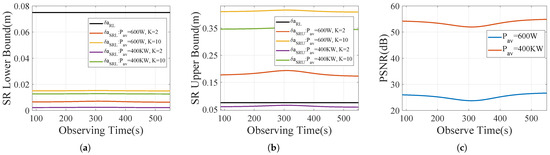 Figure 9e,f illustrates the minimum and required for imaging NAVSTAR 81. As shown in Figure 9e, the required ranges from 190 KW to 320 KW when , which imposes a significant burden on wideband imaging radar systems [54]. Additionally, the required depicted in Figure 9f to achieve the same for an MEO satellite is significantly higher than for an LEO satellite, reaching up to 2300 s during the rise and set periods.