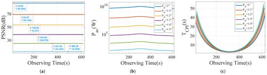 Figure 9a,b depicts the minimum and requirements for imaging COSMOS 2494. According to Figure 9a, the required average transmitted power can be met with KW when . Additionally, Figure 9b shows that the is shortest in the third visible pass due to its fast target rotation rate. Correspondingly, the required average transmitted power in the third visible pass is also the highest. This result can be attributed to two primary factors: first, due to the shorter in the third visible pass, a higher is needed to achieve sufficient PSNR, as indicated by (28); second, as shown by (26) and (27), the is inversely proportional to given that and are fixed. Consequently, the larger R in the third visible pass necessitates a higher . As illustrated in Figure 9a, the maximum difference in the required compared to other visible passes can reach nearly an order of magnitude.