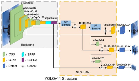 YOLOv11 is a highly efficient real-time object detection algorithm. It uses CSPDarknet as its backbone network, offering greater efficiency and richer feature extraction compared to Darknet53 in YOLOv7 and YOLOv8. PANet is introduced for feature fusion, which outperforms the FPN used in YOLOv7 and YOLOv8 in terms of efficiency. Additionally, the non-maximum suppression (NMS) process is optimized to reduce redundant detection boxes, thereby improving detection accuracy. Given the real-time requirements of drone detection, this study adopts and further optimizes the lightweight YOLOv11n model as the baseline. The YOLOv11n architecture comprises four key components: the input layer, backbone layer, neck layer, and output layer. The structural details are shown in the Figure 1 below.