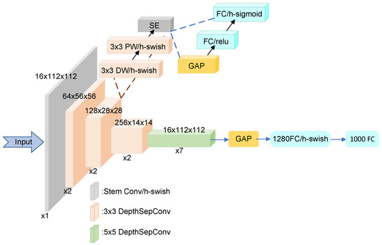 As shown in Figure 2, the LCBackbone module utilizes depthwise separable convolutions as its core building blocks, eliminating additional operations such as concat or elementwise-add to preserve inference speed. As shown in Equation (2), the H-Swish activation function in BaseNet is optimized by applying a linear transformation to the input and hardening the sigmoid output, which reduces computational complexity by minimizing exponential operations. An SE module is incorporated at the network’s final layer to improve attention to critical features through adaptive channel calibration. Additionally, a 5 × 5 convolution replaces the 3 × 3 convolution at the network’s tail, enabling high-precision detection without compromising inference speed. The structure diagram of LCbackbone is provided below.