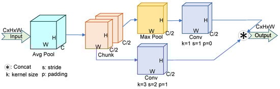 As illustrated in Figure 3, the Adown module begins by downsampling the input feature map using average pooling, reducing its size by half. The resulting feature map is divided into ×1 and ×2 parts along the channel dimension. A 3 × 3 convolution is applied to ×1 for feature extraction and dimensionality reduction. Meanwhile, ×2 undergoes max pooling followed by a 1 × 1 pointwise convolution to enhance nonlinear feature representation and further reduce dimensionality. The two processed feature maps are then combined to form the output of the Adown module. Unlike the conventional convolution-based downsampling in YOLOv11, the Adown module integrates both max pooling and average pooling, enabling more comprehensive feature extraction. Additionally, the Adown module employs a multi-branch structure, which enhances the network’s flexibility and improves the capture of features across multiple scales. This refined downsampling approach boosts the model’s capacity to extract and represent features more effectively.