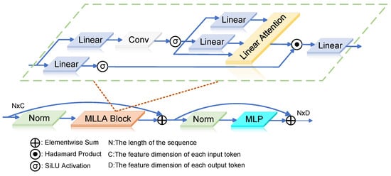 As shown in Figure 4, after the data are standardized, they enter the MLLA Block module. This module first undergoes a linear transformation through the Linear layer. The combination of linear layers, convolutional layers, and normalization operations within the MLLA Block enables the model to perform complex feature extraction and data processing. The data are then passed through the linear attention mechanism in the linear Attention module for global information aggregation. Finally, after passing through the Norm layer, the data enter the MLP module. The MLP, as a multilayer perceptron, contains multiple fully connected layers, which can perform nonlinear transformations on the data, further enhancing the model’s expressive power and extracting richer features.