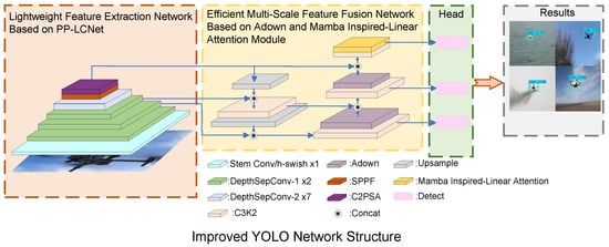 Specifically, this study enhances the conventional convolutions in the YOLOv11n backbone using LCbackbone. This architecture, centered on depthwise separable convolutions and the H-Swish activation function, optimizes computational efficiency and feature extraction capabilities, enabling the model to operate efficiently on resource-constrained devices. Additionally, a novel linear attention mechanism is proposed, incorporating a forget gate to dynamically filter critical information, thereby improving the model’s ability to focus on targets in complex backgrounds. Rotational positional encoding is used instead of absolute positional encoding, allowing the model to more accurately preserve positional information while capturing global dependencies. Furthermore, an adaptive downsampling module is introduced in the neck layer. This module uses dynamic convolutions and feature fusion to achieve efficient feature compression while retaining essential information. Finally, an improved loss function incorporates a shape similarity measure for target bounding boxes, enhancing localization accuracy.