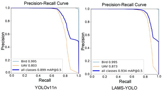 Experimental results confirm the effectiveness of the proposed lightweight design, making LAMS-YOLO particularly suitable for micro-embedded systems. To further evaluate model performance, PR curves were generated during testing at an IoU threshold of 0.5, comparing results before and after the improvements, as shown in Figure 9.