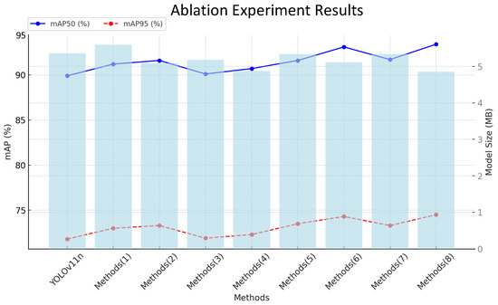 As presented in Table 2 and Figure 10, method (1) increased mAP50 by 1.45% compared to the baseline model, with a slight model size increase of 0.237 MB. This improvement is attributed to the introduction of a linear attention mechanism that utilizes rotational positional encoding (RoPE) in place of absolute positional encoding, allowing the model to better retain positional information while effectively capturing global dependencies.