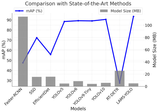 This study evaluates the proposed LAMS-YOLO method against the baseline YOLOv10n model and several established object detection algorithms, including Faster-RCNN, SSD, EfficientDet, YOLOv5, YOLOv6, YOLOv9-Tiny, and YOLOv10. The comparison uses performance metrics such as mean average precision (mAP) per category, recall, F1 score, and precision. Precision and mAP values were computed following the PASCAL VOC 2007 benchmark, with the intersection over union (IoU) threshold set at 0.5. Table 3 and Figure 12 summarize the results obtained on the custom dataset. The results show that LAMS-YOLO achieved an mAP of 93.4%, indicating a notable improvement in detection accuracy compared to the YOLOv11 baseline network. Furthermore, the mAP of LAMS-YOLO surpasses that of the YOLOv10 algorithm by 2.9% and the lightweight YOLOv9-Tiny algorithm by 4.9%.