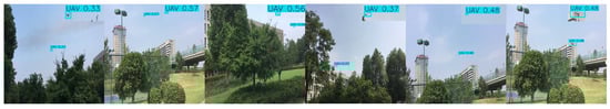 Bird images are sourced from public datasets, including 100 bird species from Kaggle, birds from the CoCo dataset, and images from the cub-200-2011 bird dataset. Drone images are drawn from the drone vs. bird dataset and DUT Anti-UAV dataset [41]. The dataset comprises 5288 images for training and 1700 images for validation, with the training set containing 1438 bird images and 3850 drone images. The validation set includes 348 bird images and 1352 drone images. The drone’s flight altitude, measured from the ground, ranges from 10 to 100 m. The dataset is labeled using a text file with five columns: category label, center coordinates (x and y) of the bounding box, width, and height.