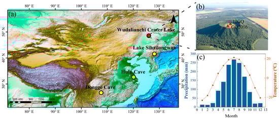 Wudalianchi Crater Lake (48°74′N, 126°00′E) is a small and enclosed crater lake located in the Wudalianchi Global Geopark, Heilongjiang Province, in northeast China (Figure 1a,b). The lake has a surface diameter of ~400 m, a total area of 6.8 × 104 m2, and an elevation of 596.9 m. The lake has no obvious riverine inputs, and it is mainly replenished by surface and subsurface runoff from a catchment area of only ~0.1 km2 []. Our study site, situated in a temperate monsoon zone, is characterized by distinct seasonal variations, with an annual average temperature of 0–0.5 °C and average precipitation of ~470 mm. The maximum temperature and precipitation occur in June, July, and August (Figure 1c). The surrounding vegetation primarily consists of mixed coniferous and broadleaf forests, dominated by birch, poplar, and larch [].
