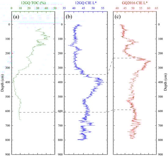 The sediment lightness of cores 12GQ and GQ2016 was measured using a Coloreader CR-700R ultraviolet/visible spectrophotometer at the School of Earth and Space Science, University of Science and Technology of China. The results were converted to Commission Internationale De L’ Eclairage (CIE) units (L*, a*, b*), where CIE L* represents sediment lightness with a measurement error of 0.5–1% [].
