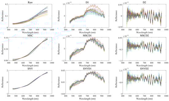 Raw spectra and eight preprocessing results (different colors represent distinct spectral curves).