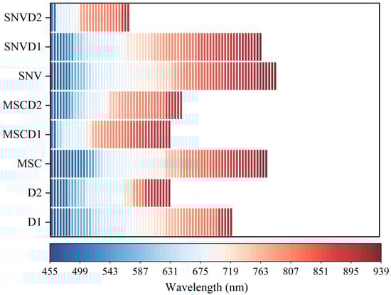 Based on the GA, 41, 62, 74, 41, 45, 77, 72, and 27 bands were selected to form the optimal spectral subsets for the preprocessing methods D1, D2, MSC, MSCD1, MSCD2, SNV, SNVD1, and SNVD2, respectively (Figure 4). The variability in the optimization of different preprocessing methods for spectral features arises primarily from their distinct sensitivities to these features. These bands were mainly concentrated in the ranges 650–730 nm and 760–910 nm, whereas bands in the 455–480 nm, 510–560 nm, and 730–760 nm ranges were rarely selected, which may be related to the properties of the chemical bonds and their spectral absorption characteristics [].