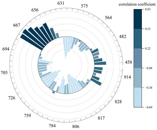 Based on the D2 and GA, the optimal spectral subset with 62 spectral bands was selected, and their correlations with TOC were further analyzed (Figure 5). Bands within the range of 656–669 nm showed significant positive correlations with TOC, with all correlation coefficients exceeding 0.55 (p < 0.01), demonstrating their sensitivity for the estimation of TOC. In particular, the correlation of the 667 nm band with TOC was the highest (0.83). This might be influenced by carbon–iron oxide interactions, such as hematite and acicular iron ore [], or associated with chemical bonds, including C-H, N-H, C-O, C=O, O-H, and Al-OH [], which contribute to the distinct spectral absorption features. In addition, bands in the ranges of 578–634 nm, 726–756 nm, and 806–817 nm displayed strong negative correlations below −0.40 (p < 0.01) with TOC. Other studies have also indicated significant correlations between 500 and 800 nm bands and soil TOC, highlighting their potential to estimate TOC [,,].
