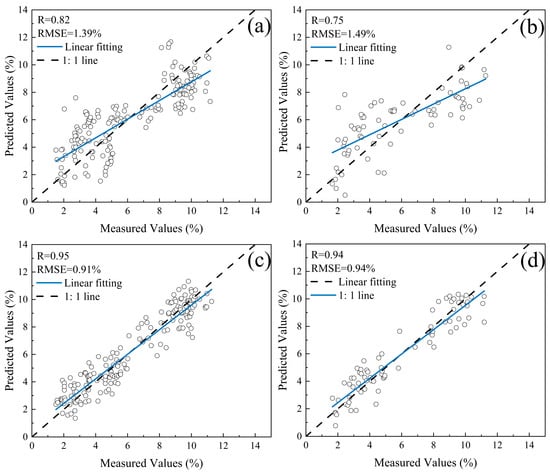 where n denotes the number of samples, denotes the i-th measurement, denotes the i-th estimated value, and denotes the average measurement. High R-values and low RMSE-values indicate a significant linear relationship between the model estimations and actual measurements.