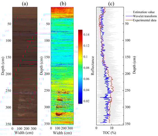 Within the 350–200 cm depth interval of the core, TOC varied around 7%; at 200–150 cm, TOC decreased from 7% to 4%; and above 150 cm, it stabilized at an average of 2% (Figure 7c), indicating that TOC decreased significantly as the depth decreased. A comparison with the RGB image (Figure 7a) revealed that the TOC was lower in the darker layers and vice versa. Meanwhile, the TOC content increased as the reflectance increased (Figure 7b). This phenomenon may be attributed to the balance between the absorption and scattering effects of the TOC. As TOC increases, the concomitant rise in reflectance values, as the scattering effect surpasses the absorption effect, manifests as brighter layers in the RGB image.