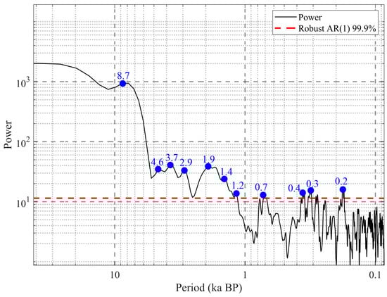 Given that the high-resolution TOC data reconstructed using the PLSR model showed significant millennial-scale fluctuations, further power spectral analysis was conducted (Figure 8). The results indicate significant quasi-periodic signals at ~8.7, 4.6, 3.7, 2.9, 2–1, 0.7, 0.4, 0.3, and 0.2 ka during the 38–13 ka BP period, all of which exceed the 99.9% confidence threshold. The ~8.7 ka cycle is generally consistent with the half-precession cycle [], potentially reflecting low-latitude processes (e.g., summer monsoon), while the ~2–1 ka cycle corresponds to the quasi-periodic signature of the Dansgaard–Oeschger (DO) cycle during glacial periods [], which is likely to be a high-latitude signal.
