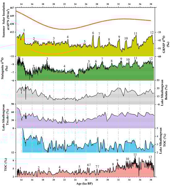 Comparison of TOC reconstructed based on the PLSR model (red) with 65° N summer solar radiation (orange line) [], NGRIP Greenland ice core δ18O record (yellow) [], stalagmite δ18O records from Dongge Cave and Hulu Cave (green) [,], Betula pollen records from Lake Sihailongwan (gray) [], tree and shrub pollen records from Lake Sihailongwan (purple) [], and TOC records from Lake Sihailongwan (blue) []. The numbers in the figure represent obvious millennium-scale fluctuations.