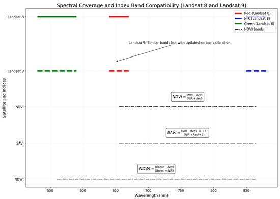 Figure 2 illustrates the spectral coverage and complementarity of the relevant Landsat 8 and Landsat 9 bands, highlighting the bands used to calculate the NDVI, SAVI, and NDWI, with their corresponding wavelength ranges. The satellite imagery was preprocessed using the Google Earth Engine (GEE) platform to ensure data reliability and consistency. This preprocessing involved cloud masking, radiometric calibration, and atmospheric corrections. Cloud masking was applied using the Landsat surface reflectance QA band to exclude pixels affected by clouds and shadows. Radiometric calibration standardized the data across the acquisition dates, converting digital numbers into surface reflectance values. Atmospheric corrections were applied to account for the effects of aerosols and water vapor, improving the accuracy of the spectral bands used for the vegetation indices.