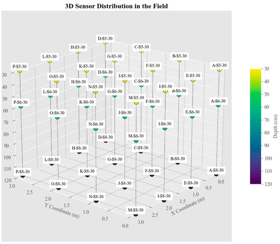 Three-dimensional spatial distribution of sensors in the field. The horizontal plane (X and Y coordinates) represents the layout of the field, where the distances in meters are illustrative and do not reflect the actual distance between sensors. In contrast, the vertical axis (Z coordinate) corresponds to the sensor placement depth in centimeters.