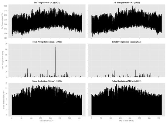 Temperature, precipitation, and solar radiation variability for 2021 and 2022.