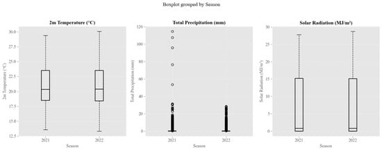 Boxplots were employed to summarize the seasonal distributions of temperature, total precipitation, and solar radiation, offering a clear overview of the variability in these meteorological variables across both years (Figure 5). For the temperature, the interquartile range remained similar in both 2021 and 2022, with median temperatures slightly above 20 °C; however, the data showed considerable fluctuations, reflecting daily temperature changes. Precipitation exhibited high skewness, with most daily measurements showing minimal or no rainfall, while extreme outliers represented significant rainfall events that occurred sporadically throughout the year. This variability underscores the challenges of managing irrigation during dry weather interrupted by heavy rainfall. Solar radiation followed a similar seasonal pattern in both years, with higher values in the dry season and lower values in the wet season. The interquartile range and median values were comparable across both years, demonstrating the consistency of solar radiation throughout the growing seasons.