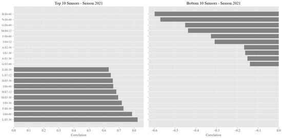 The bottom 10 sensors for both seasons show significantly lower or negative correlation coefficients, indicating discrepancies between field measurements and satellite estimates. These results highlight the variability in sensor performance based on placement and environmental conditions. This visualization provides a comprehensive overview of the most and least effective sensors, aligning with the conclusion that a 30 cm depth consistently yields the most reliable data for satellite validation.