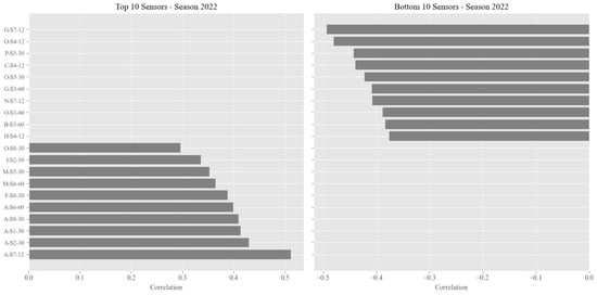 The previous analysis is complemented by Figure 6, which visually highlights the performance of the top 10 and bottom 10 sensors based on their correlations with satellite-derived soil moisture data from the 2021 and 2022 seasons. The bar plots on the left depict the sensors with the highest positive correlation coefficients, emphasizing those that closely align with satellite measurements, while the plots on the right display the sensors with the lowest or negative correlation coefficients, indicating a weaker or inverse relationship.