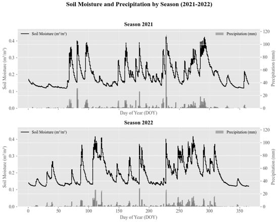 For the 2021 season, the soil moisture data show a strong response to precipitation events, with notable increases following rainfall. Periods of high precipitation correspond to sharp rises in soil moisture, which gradually declines during dry periods, reflecting typical hydrological processes. Similarly, the 2022 season exhibits consistent patterns, with soil moisture levels closely tracking precipitation events. However, variations in the magnitude of soil moisture compared to 2021 may indicate differences in the seasonal rainfall intensity, distribution, or land surface conditions. These results suggest that integrating meteorological precipitation records further enhances the understanding of soil moisture fluctuations, emphasizing the satellite data’s applicability for large-scale and long-term environmental monitoring. In addition to this, it also highlights the reliability of remote sensing technologies for capturing soil moisture dynamics on a broader temporal scale.