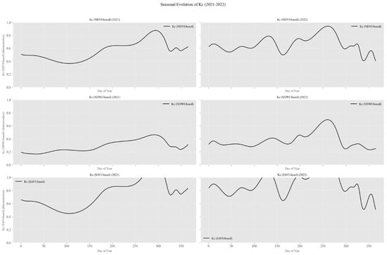 Figure 9 illustrates the seasonal evolution of Kc, derived from the NDVI, for both the 2021 and 2022 growing seasons. The graphs depict the Kc values calculated from the NDVI, NDWI, and SAVI across both years, providing a comprehensive understanding of crop water dynamics. Each index reveals distinct patterns of temporal variability corresponding to changes in vegetative growth, water availability, and phenological stages.