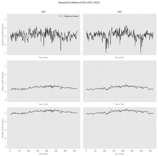 Estimating ETo is essential for understanding the water requirements of the avocado orchard, particularly for developing irrigation strategies that are responsive to seasonal changes in climate. ETo estimates were derived using three meteorological models: the Hargreaves–Samani, Blaney–Criddle, and Priestley–Taylor models. These models provided a range of estimates, each with strengths and limitations, making it crucial to analyze their seasonal trends and the variability in ETo values across the different methods.
