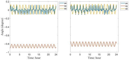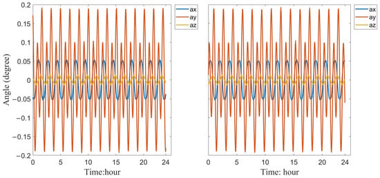For nominal attitude control, the accuracy of GRACE-FO attitude is better than 30 mrad at the 3σ confidence level [24]. According to the previous studies, the RMS of the rotation angles between real quaternions and the nominal attitudes of Sentinel-3B and Sentinel-6A are generally at the same level, around or below 0.1 degree [26].