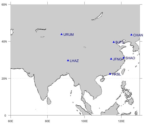 About 22 global stations were selected to form a sparse network, and among them, 7 stations were selected to form the regional network to be used for the experiments. The distribution of these stations is shown in Figure 3 and Figure 4.