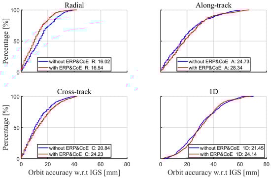 Finally, the cumulative distribution of orbit errors with and without ERPs and geocenter estimation is shown in Figure 7. The horizontal axis of each subplot represents the orbital accuracy in the radial, along-track, cross-track, and 1D directions compared with the International GNSS Service (IGS) final product in millimeters, while the vertical axis indicates the percentage distribution. When ERPs and geocenter are estimated in the integrated POD, the GPS orbit accuracy amounts to 16.5 mm, 28.3 mm, 24.24 mm, and 24.1 mm in the radial, along-track, cross-track, and 1D directions, respectively, as shown in Figure 7. The situation improves without estimating the ERPs. The final statistical results indicate that the integrated POD accuracy, when estimating the ERPs and the geocenter, degrades by 3.25%, 14.6%, and 13.4% in the radial, along-track, and cross-track directions, respectively, compared to the strategy that does not estimate the ERPs. Since ERP is strongly correlated with the orbit, when the ground network is sparse/regional, which is not an ideal situation for high-precision GNSS orbit determination, estimating it during the adjustment process is likely to introduce more inaccurate parameters. That leads to a reduction in accuracy.